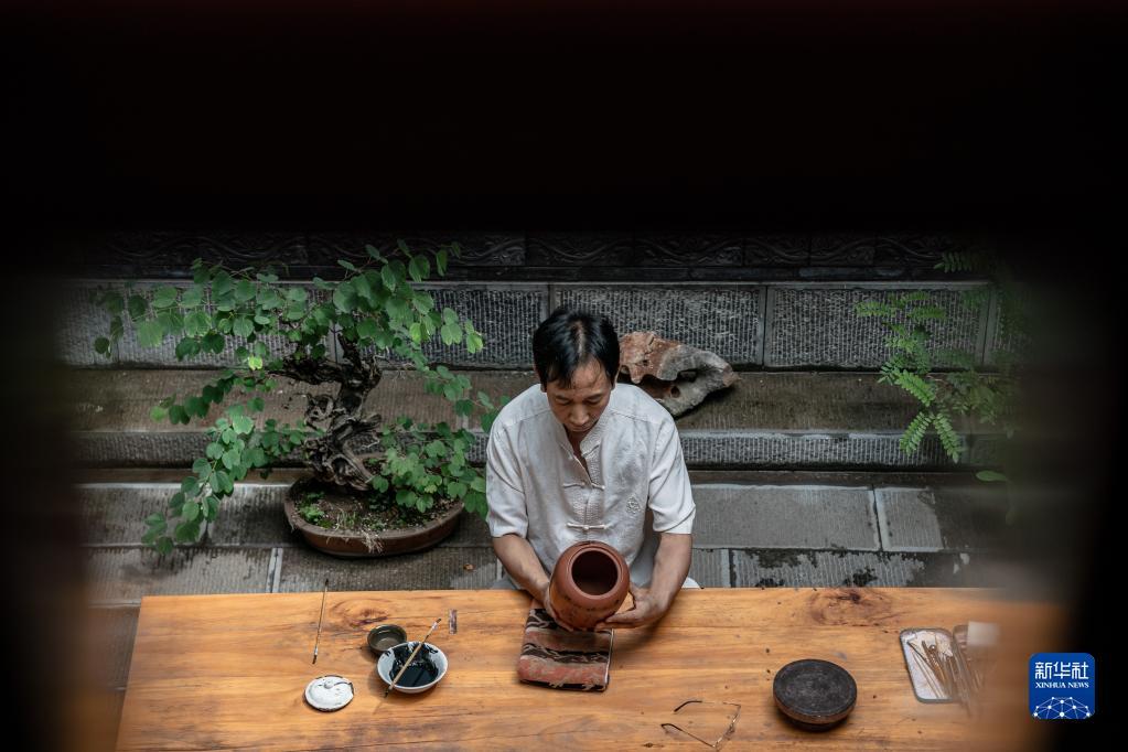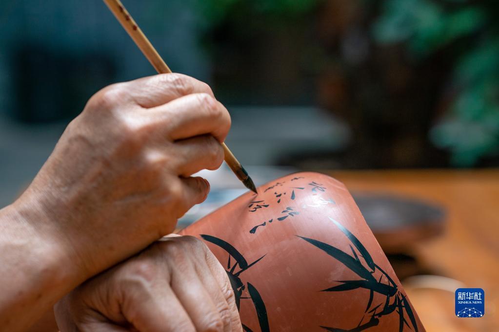 紫陶艺人徐荣洪在院落里对陶坯进行书画装饰(6月30日摄)。
