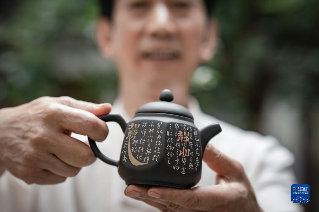 紫陶艺人徐荣洪展示他制作的紫陶茶壶(6月30日摄)。