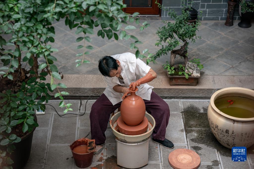 紫陶艺人徐荣洪在院落里拉坯(6月30日摄)。