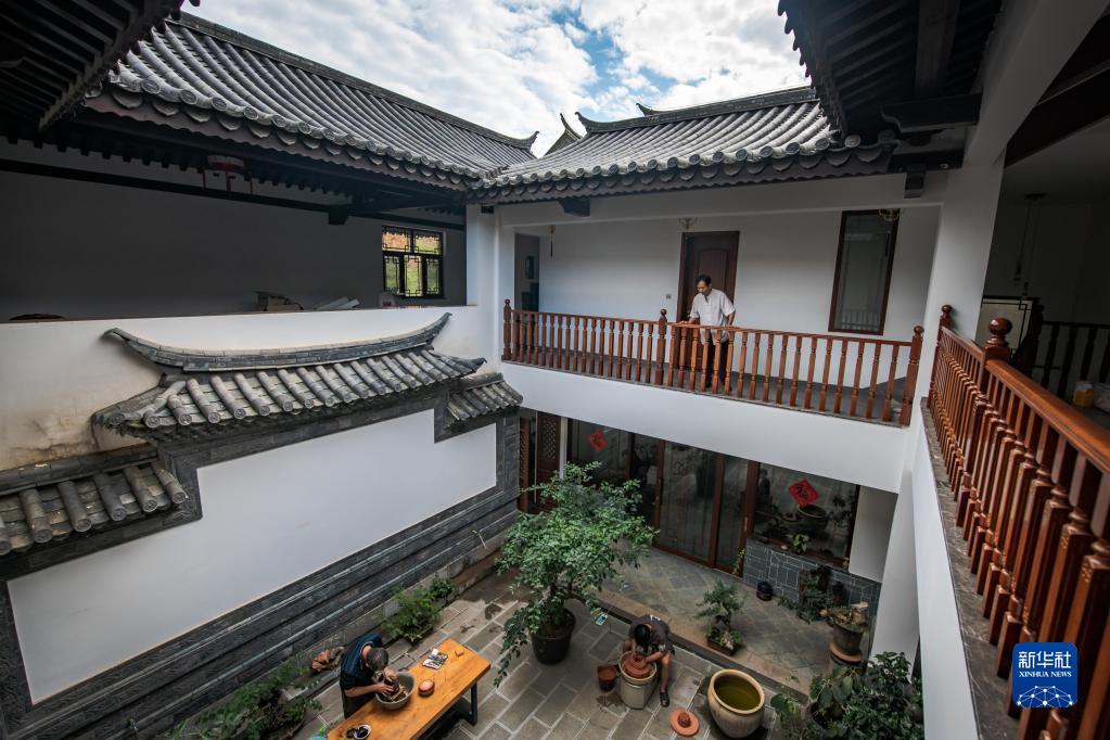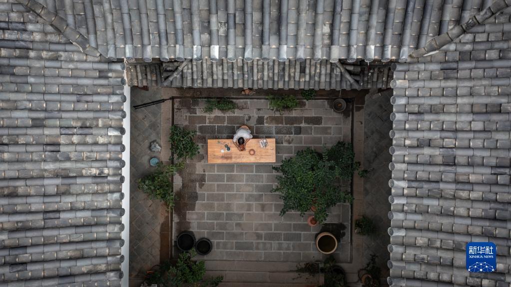 紫陶艺人徐荣洪在院落里对陶坯进行书画装饰(无人机照片,6月30日摄)。