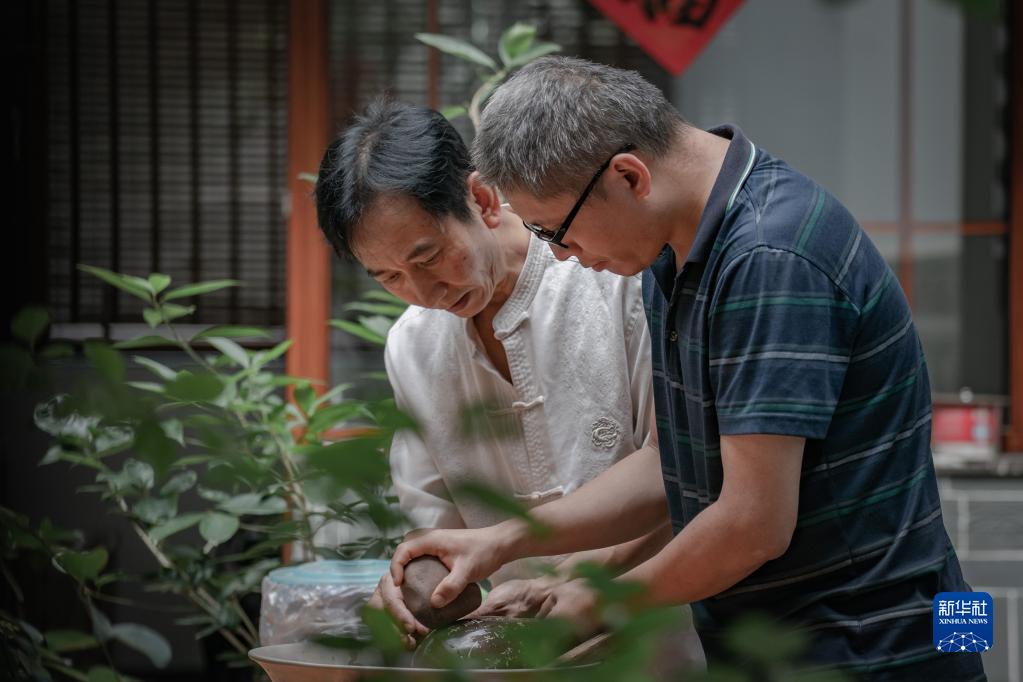 紫陶艺人徐荣洪在观看学徒制作建水紫陶(6月30日摄)。