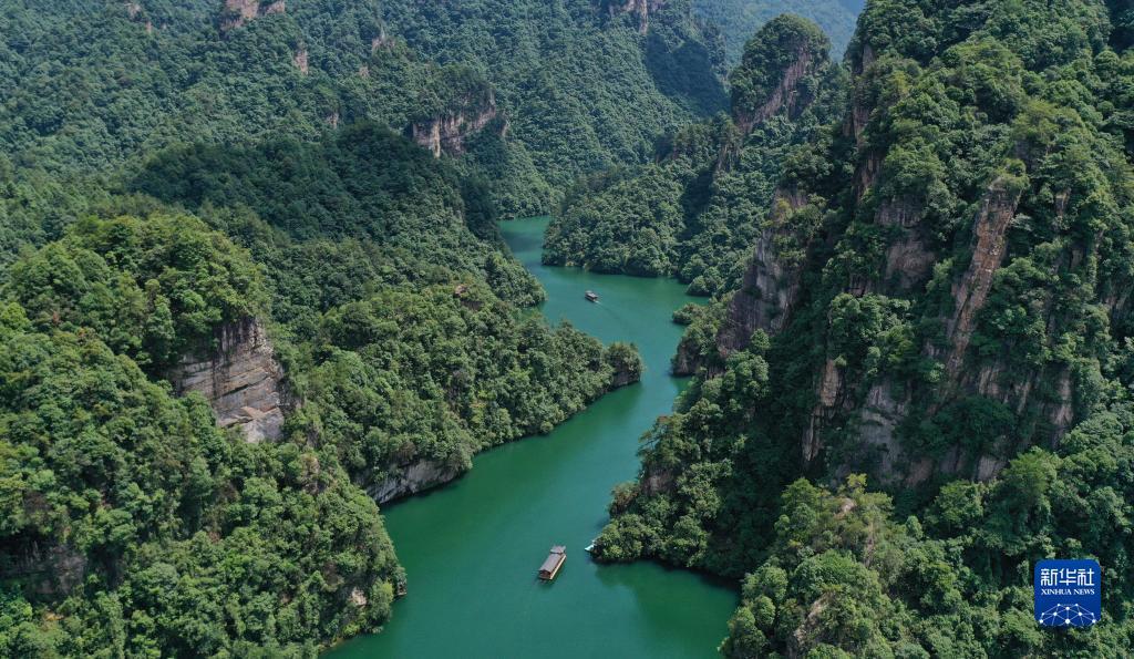7月8日,游人乘船在张家界市宝峰湖景区游玩(无人机照片)。