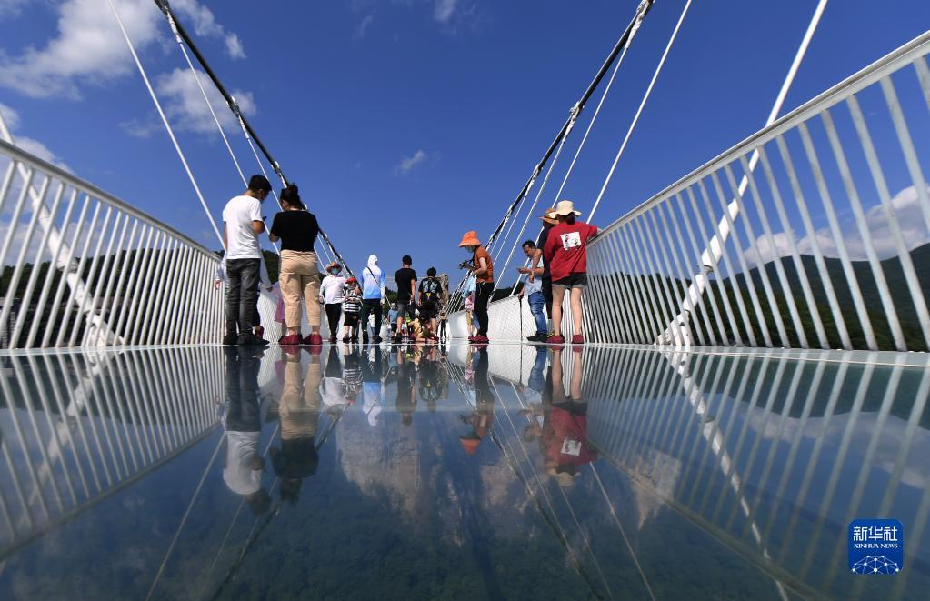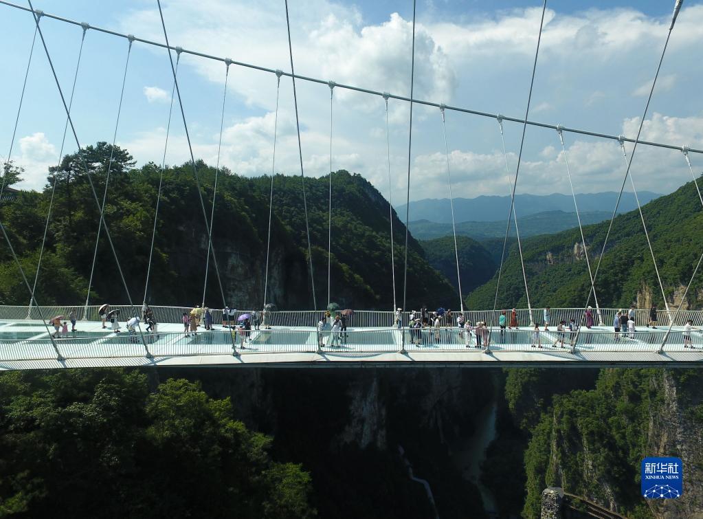 7月8日,游人在张家界大峡谷玻璃桥游玩。