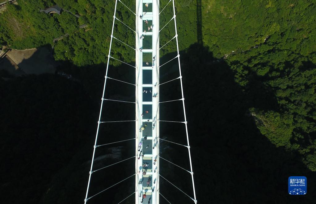 7月8日,游人在张家界大峡谷玻璃桥游玩(无人机照片)。