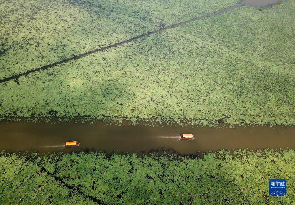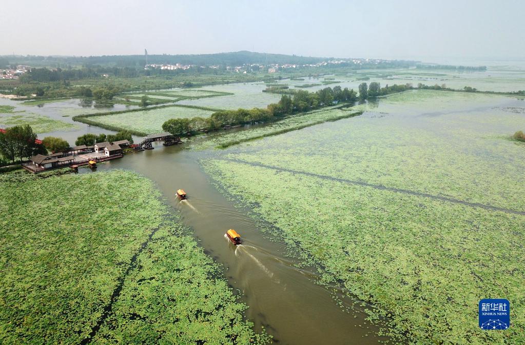 7月21日,游客乘坐游船在微山湖旅游区内游览(无人机照片)。