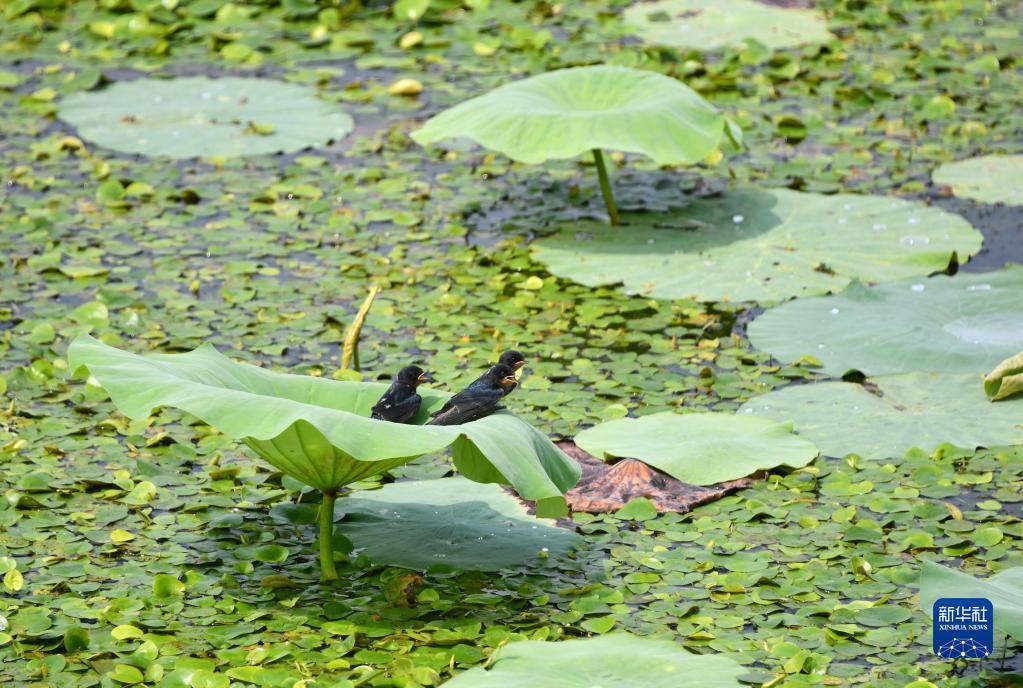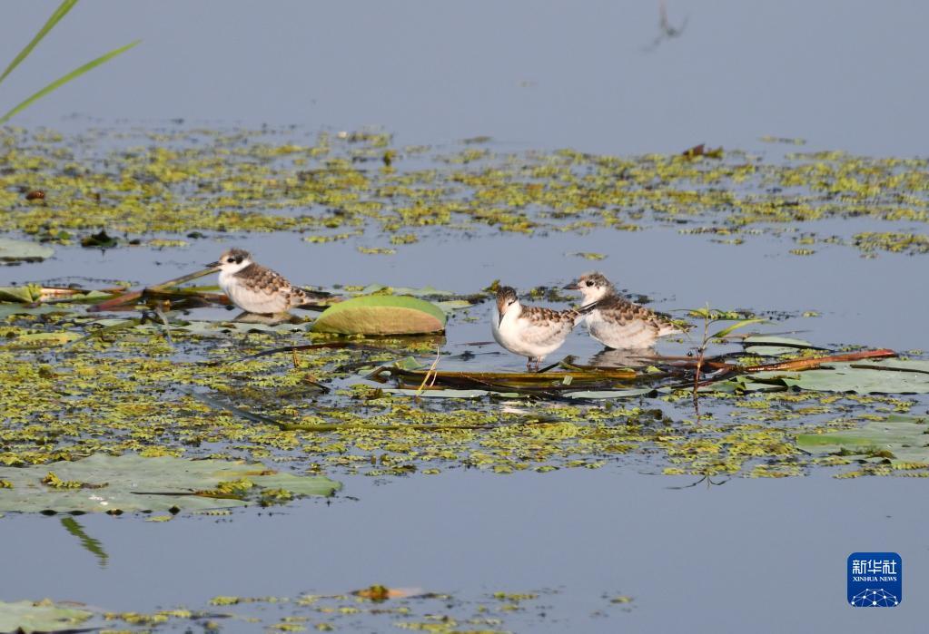 野生鸟类在微山湖旅游区内的湿地栖息(7月21日摄)。
