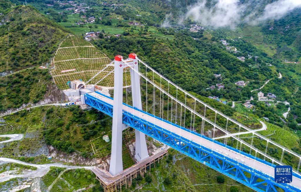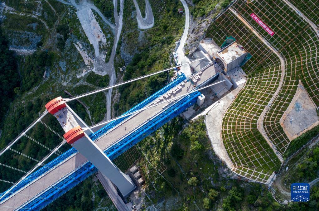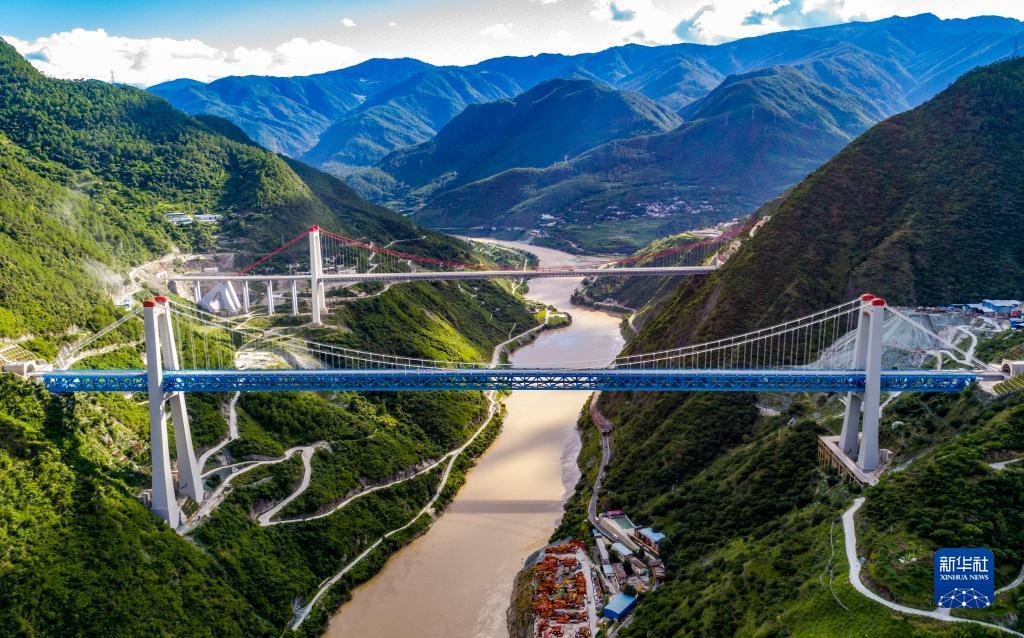 7月27日拍摄的丽香铁路金沙江特大桥(无人机照片)。大桥左边连接哈巴雪山隧道,右边连接玉龙雪山隧道。