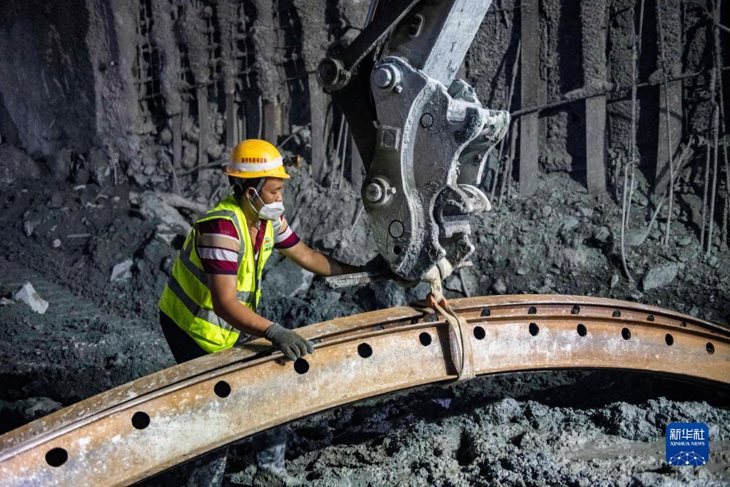 7月27日,在中铁十六局哈巴雪山隧道项目建设现场,一名工人在辅助吊装钢拱架。
