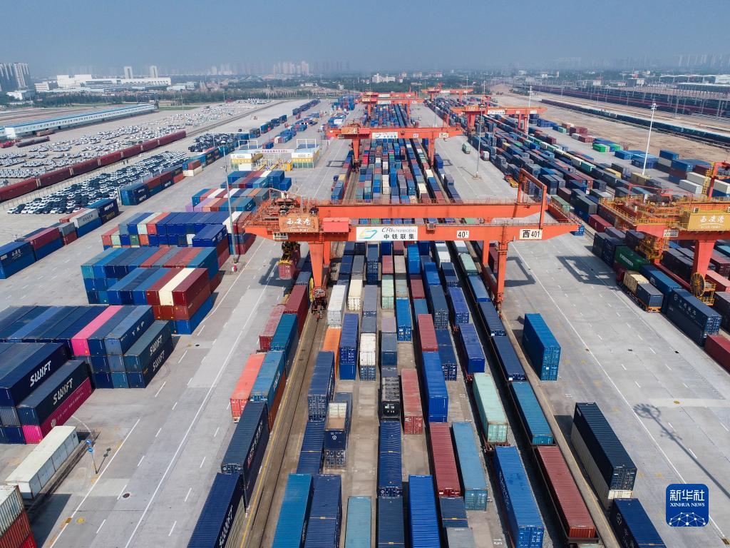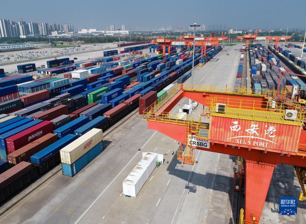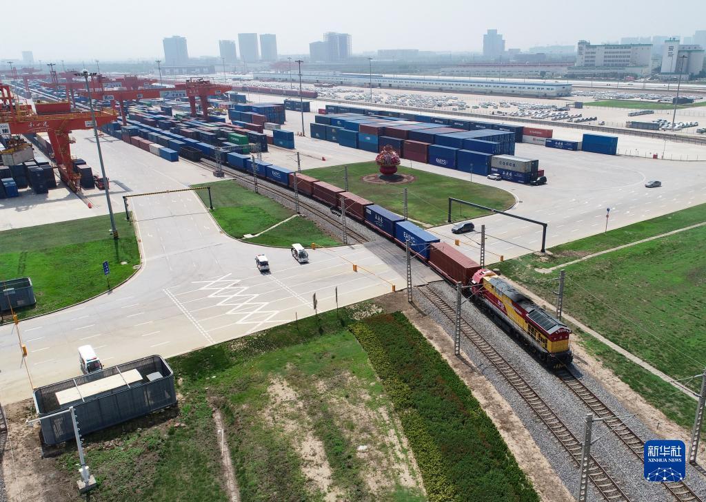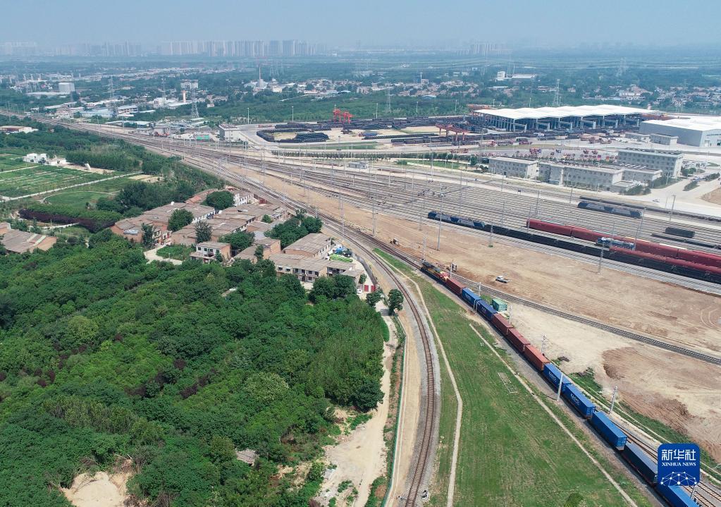 7月29日,X9015次中欧班列长安号从西安国际港站出发开往哈萨克斯坦(无人机照片)。