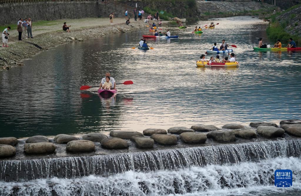 在江西省靖安县中源乡三坪村,“避暑住客”在小河里划船游玩(7月27日摄)。