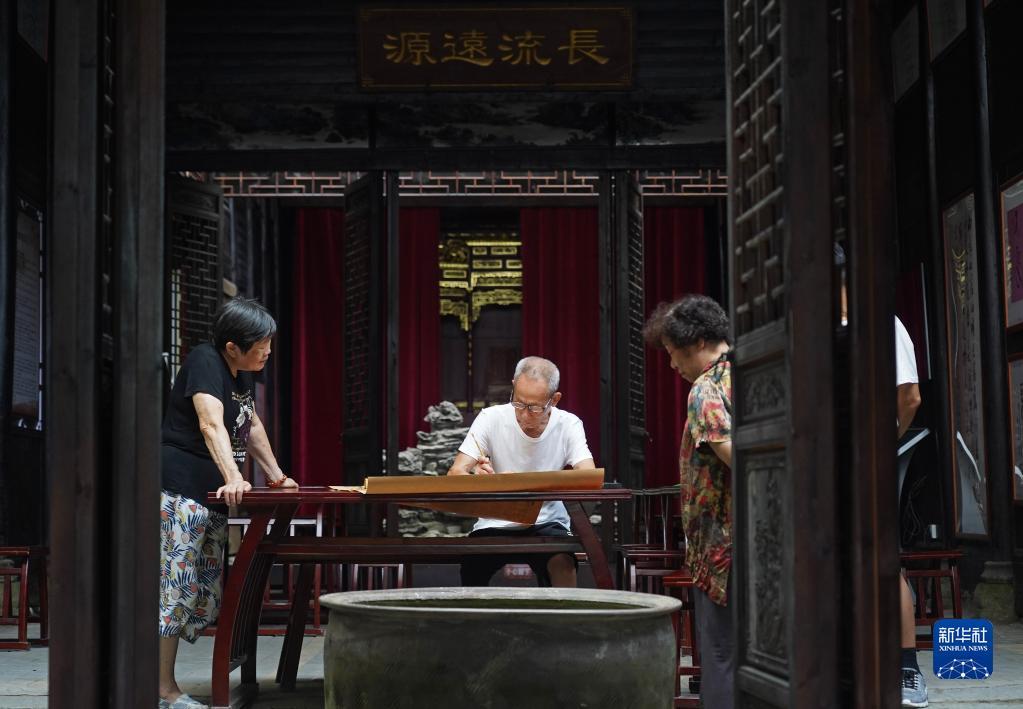 在江西省靖安县中源乡三坪村,“避暑住客”在一处老屋内练习书法(7月27日摄)。