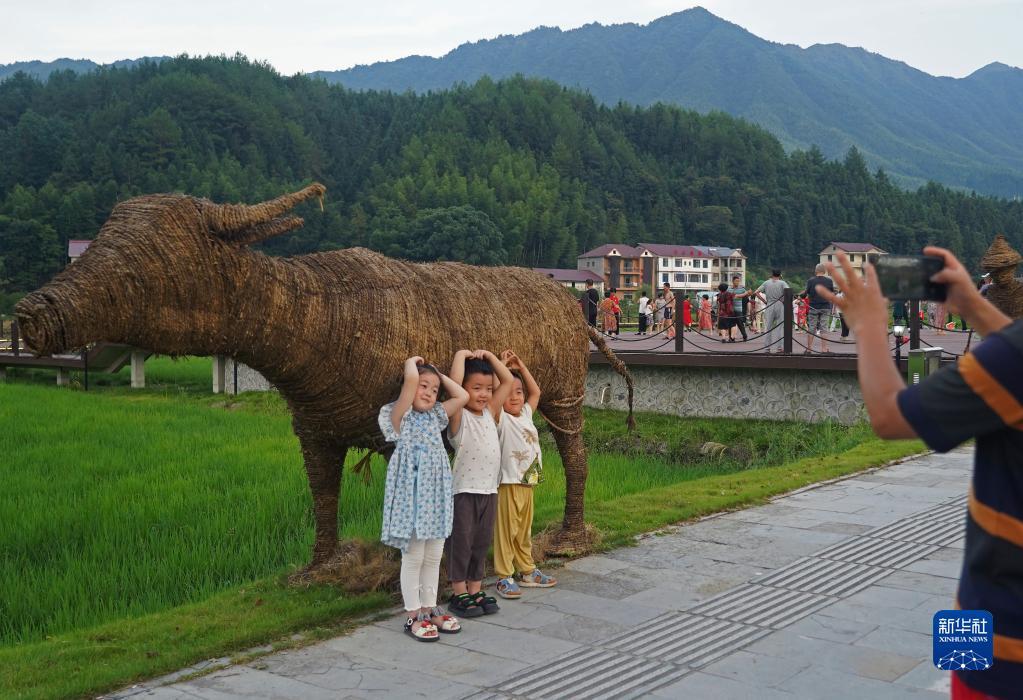 在江西省靖安县中源乡三坪村,“避暑住客”给孩子们拍照(7月27日摄)。