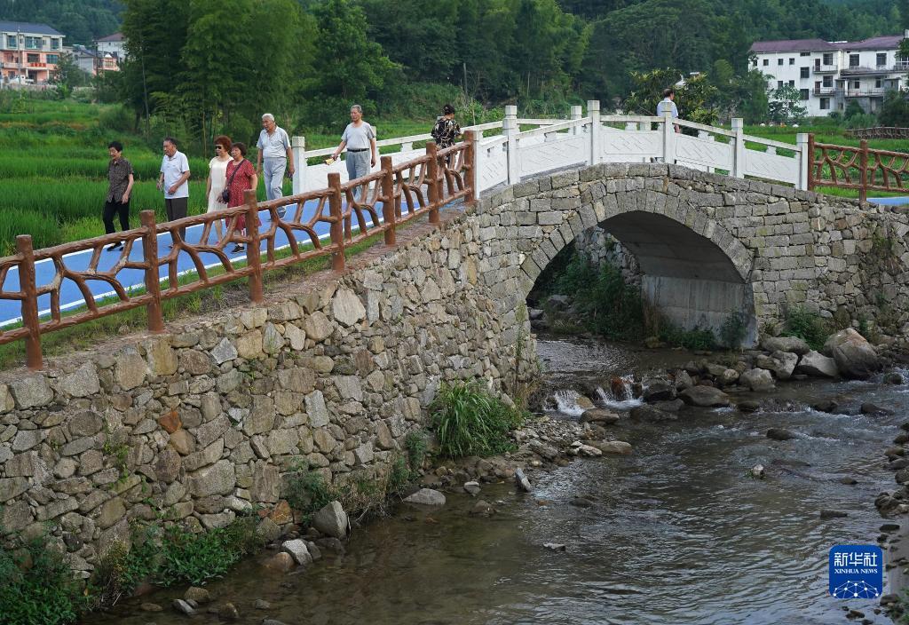 在江西省靖安县中源乡三坪村,“避暑住客”在小溪边散步(7月27日摄)。