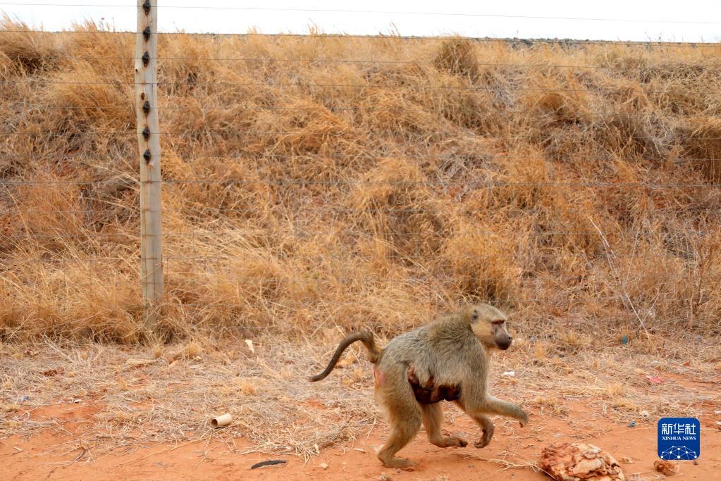这是7月28日在肯尼亚察沃拍摄的蒙内铁路线隔离栅栏外的狒狒。