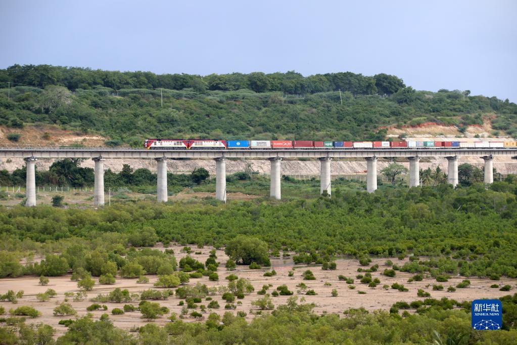 7月27日,在肯尼亚蒙巴萨红树林旁,一列货运列车行驶在蒙内铁路线上。