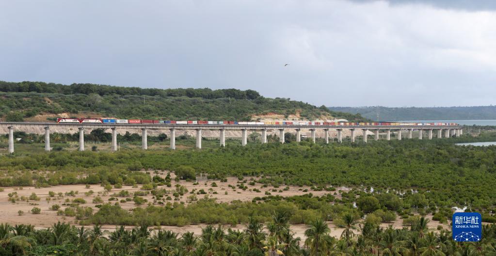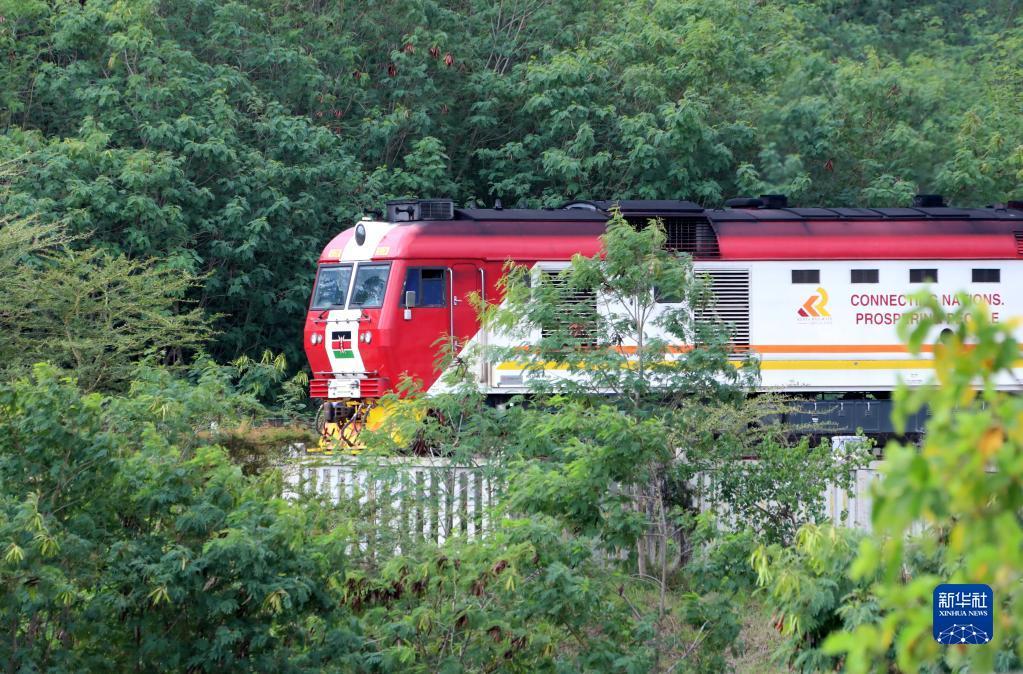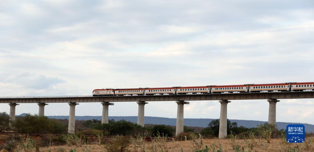 7月28日,一列客运列车在肯尼亚察沃国家公园附近的蒙内铁路察沃河特大桥上行驶。