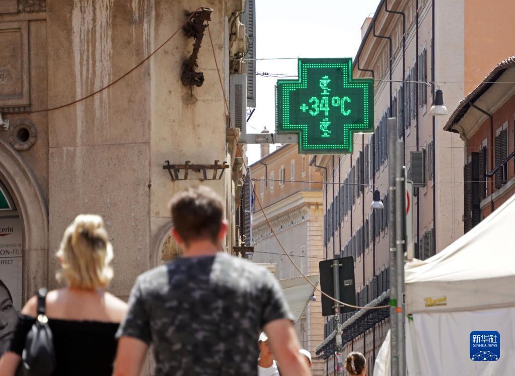 8月2日,意大利罗马一处药店的温度计显示实时温度为34摄氏度。
