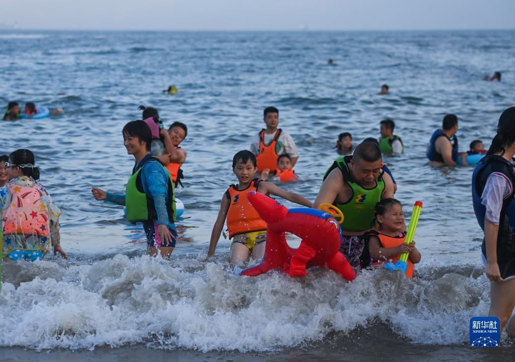 8月2日傍晚,游客在朱家尖南沙景区游玩。