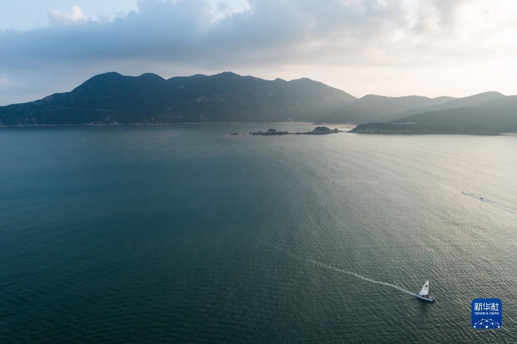 8月2日傍晚,一艘帆船载着游客在朱家尖南沙景区的海面上游玩(无人机照片)。