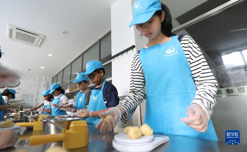 8月4日,在辽宁省沈阳市浑南区第九小学,参加暑期托管班的学生学习做月饼。