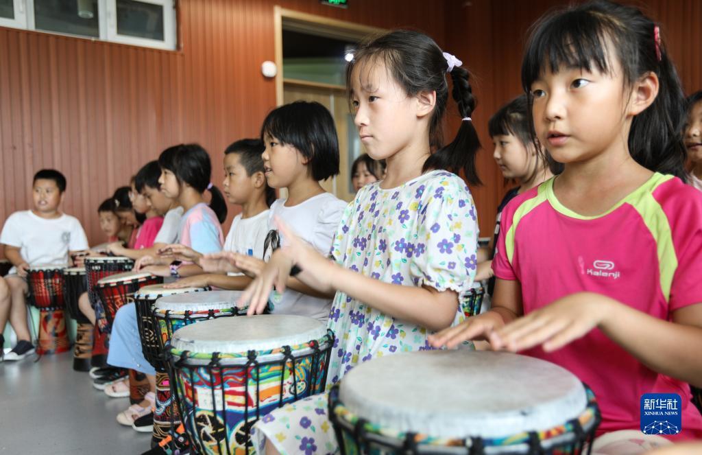 8月4日,在辽宁省沈阳市浑南区第九小学,参加暑期托管班的学生学习非洲鼓。
