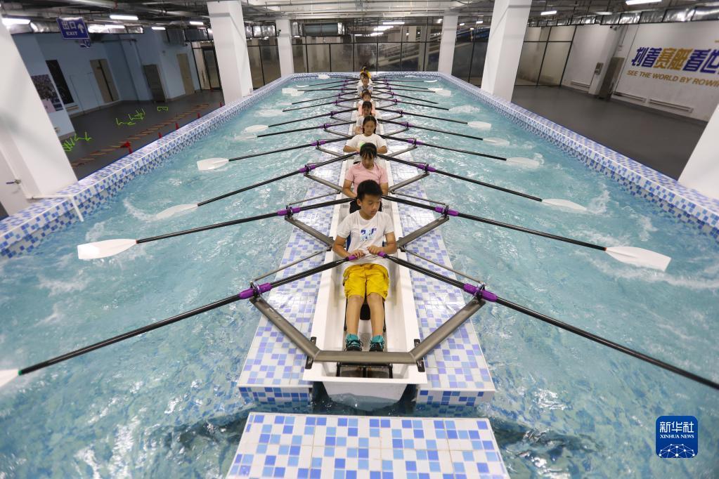 8月4日,在辽宁省沈阳市浑南区第九小学,参加暑期托管班的学生在赛艇池练习。