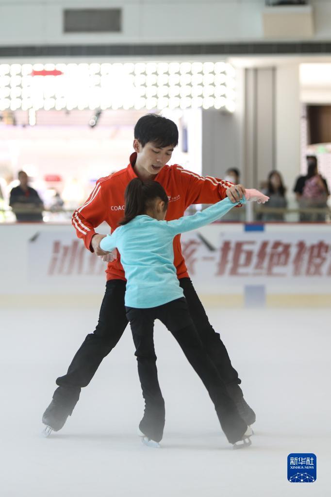 8月4日,在辽宁省沈阳市冰纷万象冰场,一名小朋友在教练的指导下学习花样滑冰。