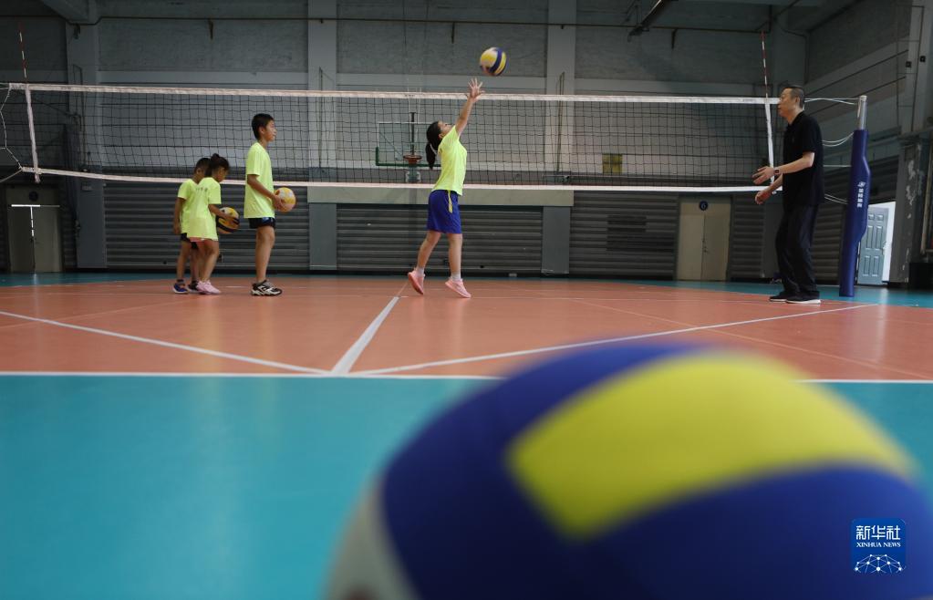 8月5日,在辽宁省沈阳市沈阳体育学院开展的暑期夏令营,小朋友们在练习排球。