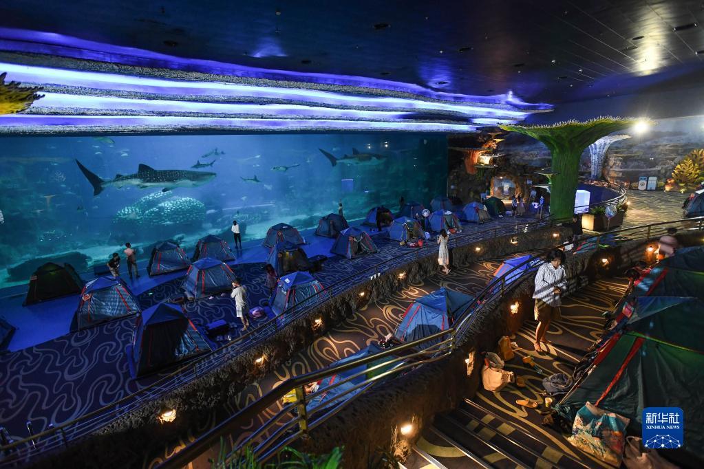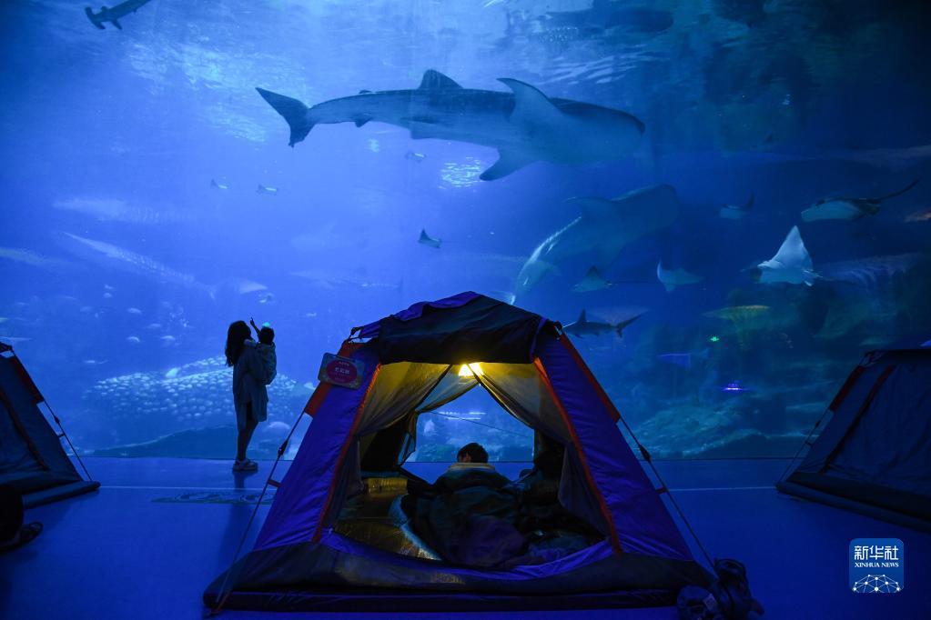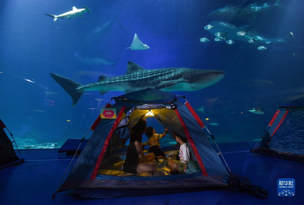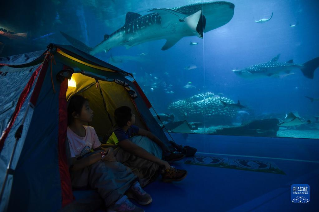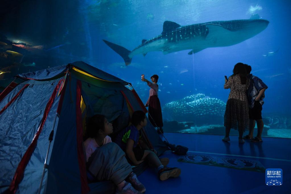 8月27日,体验者在珠海长隆海洋王国鲸鲨馆搭帐篷夜宿,在鲸鲨保育专家的科普中增长知识,近距离体验与鲸鲨等海洋生物同眠的奇妙之夜,感受人与自然和谐相处,传递生态保护理念。