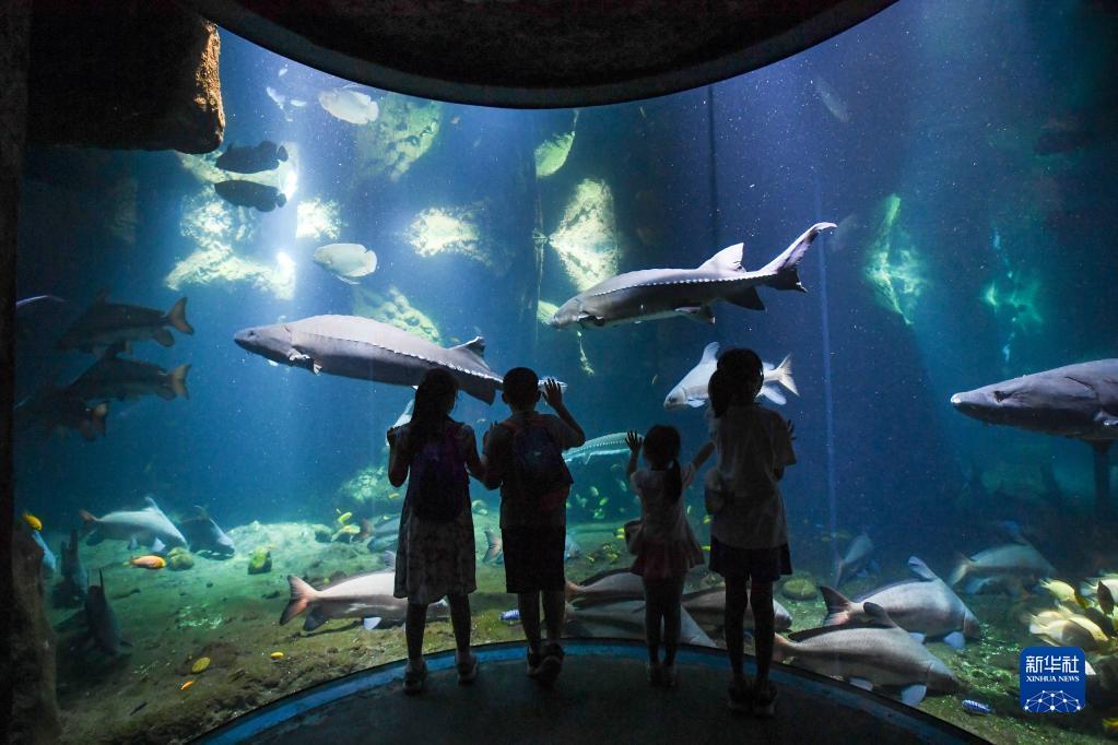 体验者在珠海长隆海洋王国鲸鲨馆与鲸鲨“近距离接触”(8月27日摄)。