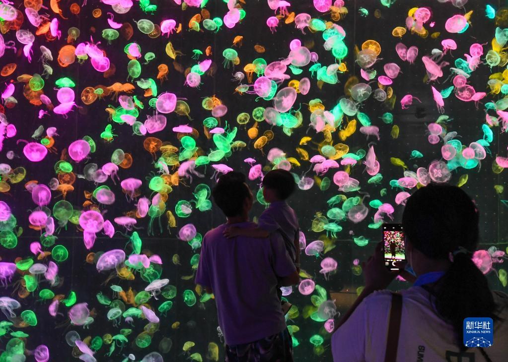 夜宿在珠海长隆海洋王国鲸鲨馆的体验者夜游海洋王国(8月27日摄)。