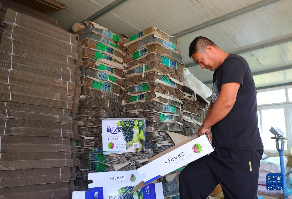 9月6日,在丁家房镇大蛇山子村,果农在整理葡萄包装盒。