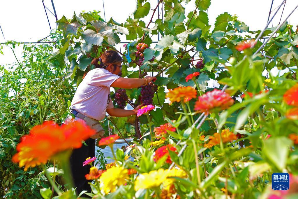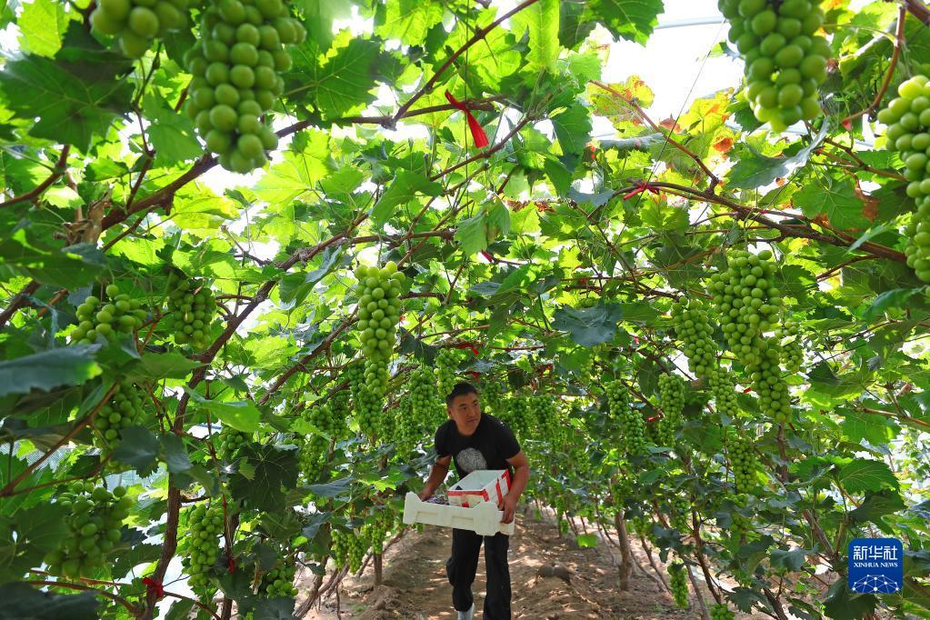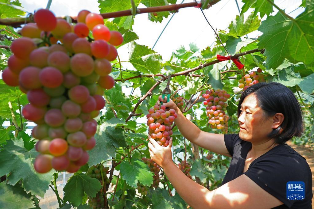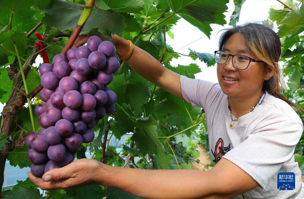 9月6日,在丁家房镇大蛇山子村,果农在大棚里采摘葡萄。