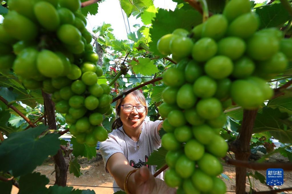 9月6日,在丁家房镇大蛇山子村,果农在大棚里查看葡萄成熟情况。