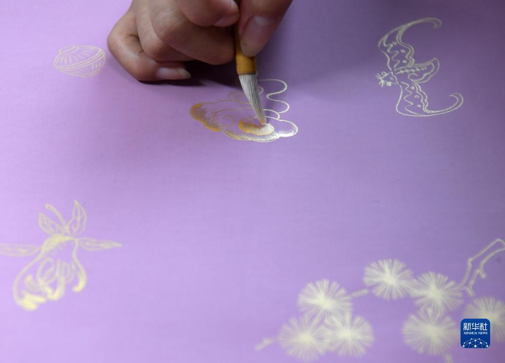 9月8日,纸笺加工技艺传习基地的工人在粉蜡笺上进行描金。
