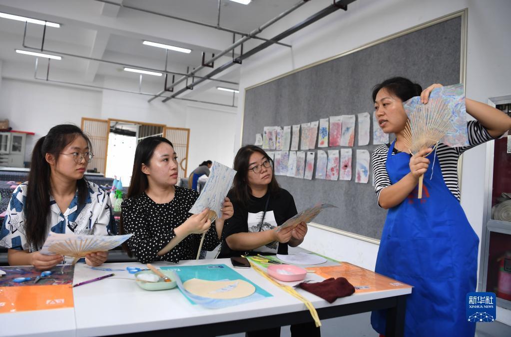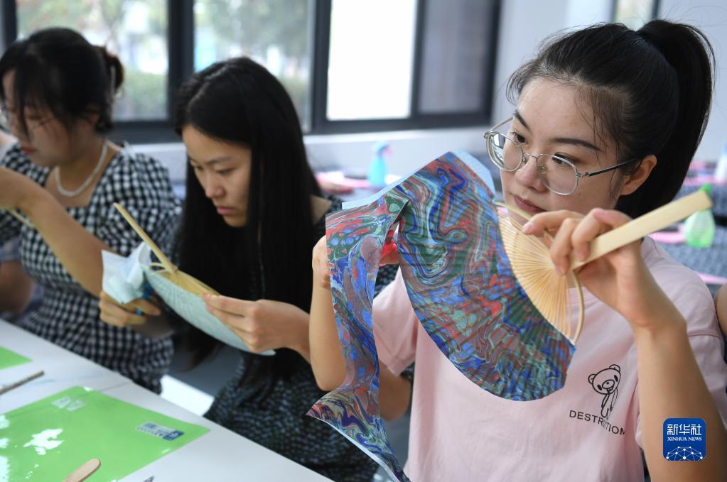 9月8日,在纸笺加工技艺传习基地,爱好者体验用流沙笺制作扇面。