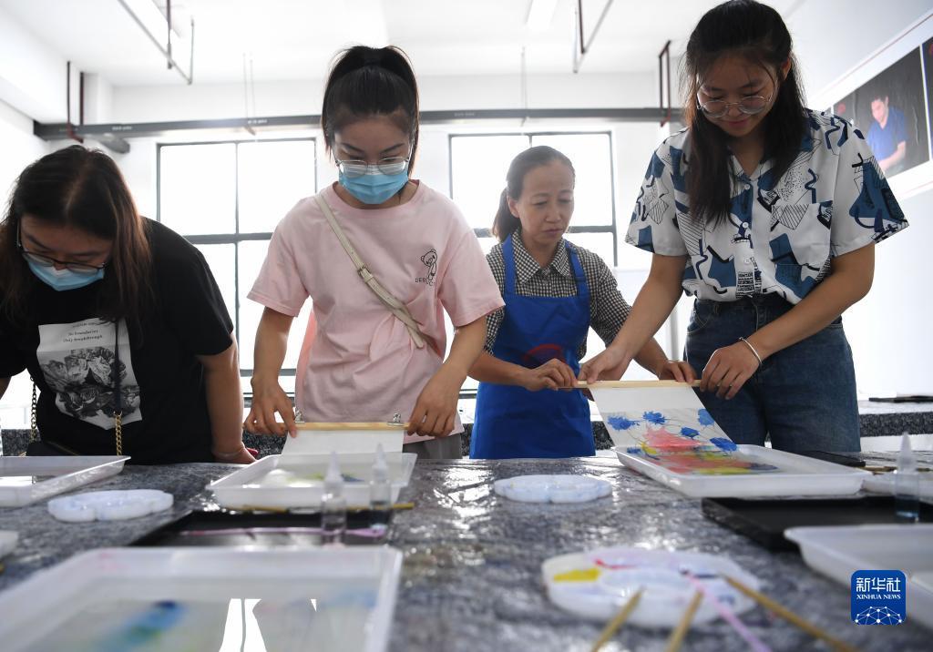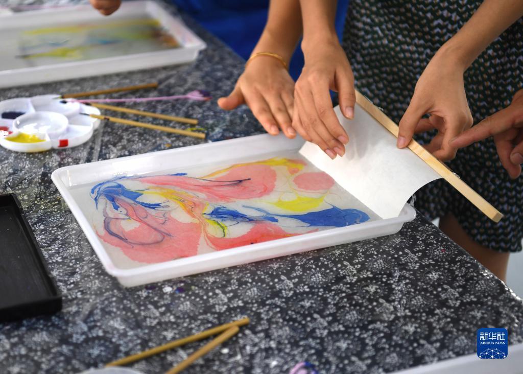 9月8日,在纸笺加工技艺传习基地,爱好者在体验流沙笺的制作工艺。