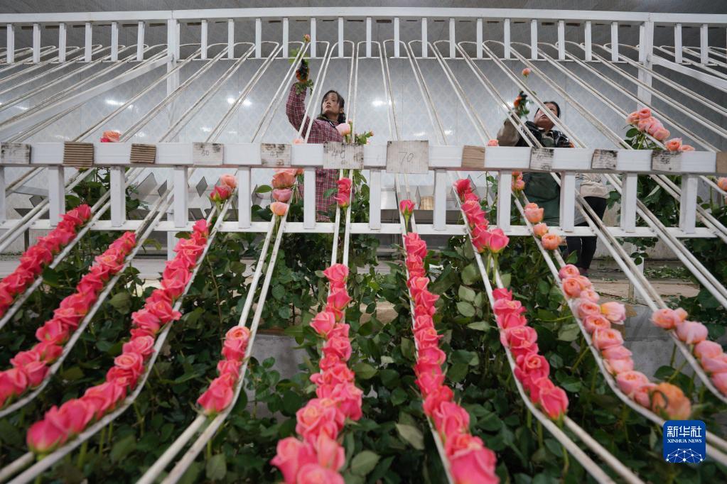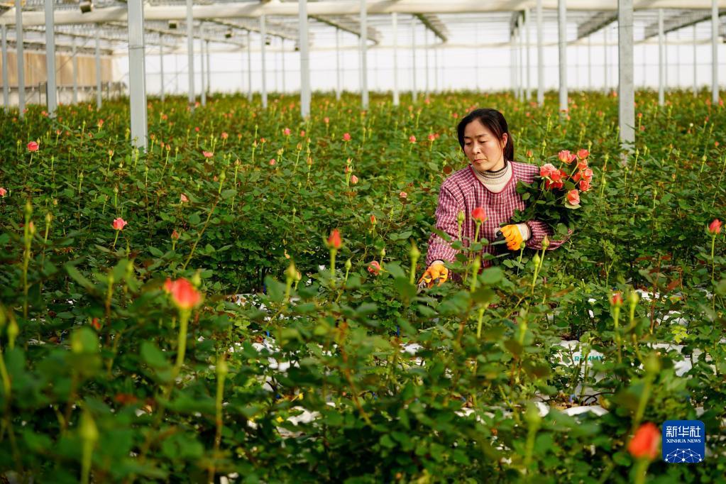 2月1日,村民在河北邱县盛水湾玫瑰产业园采收玫瑰花。