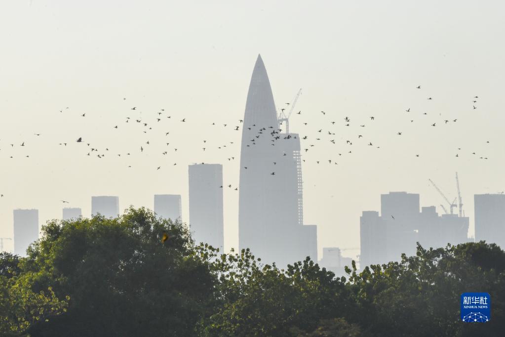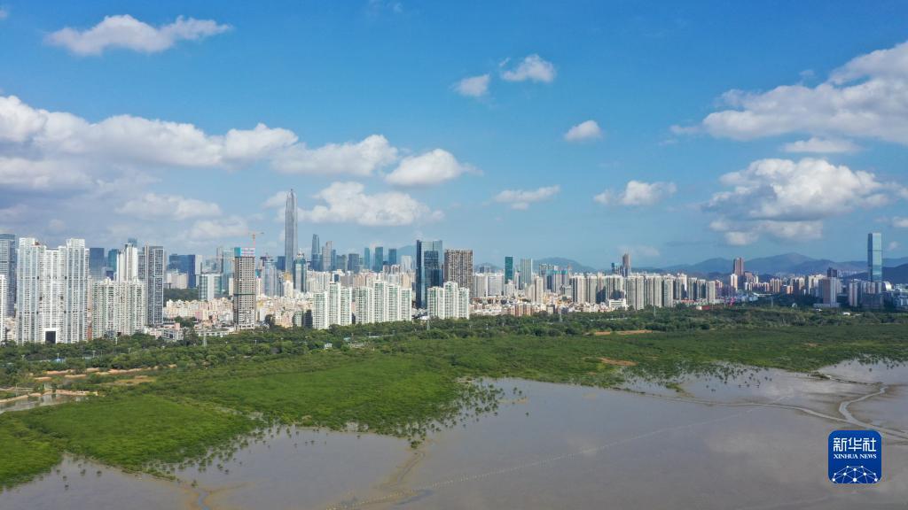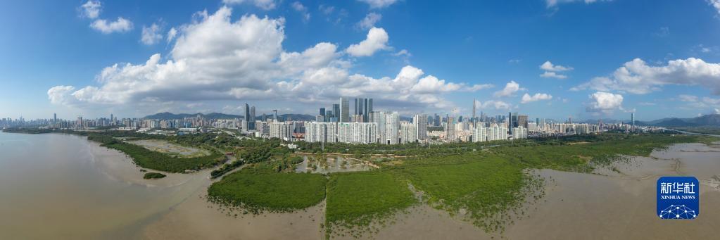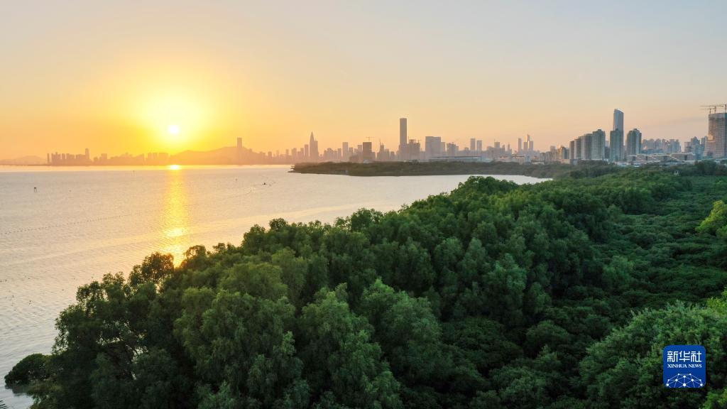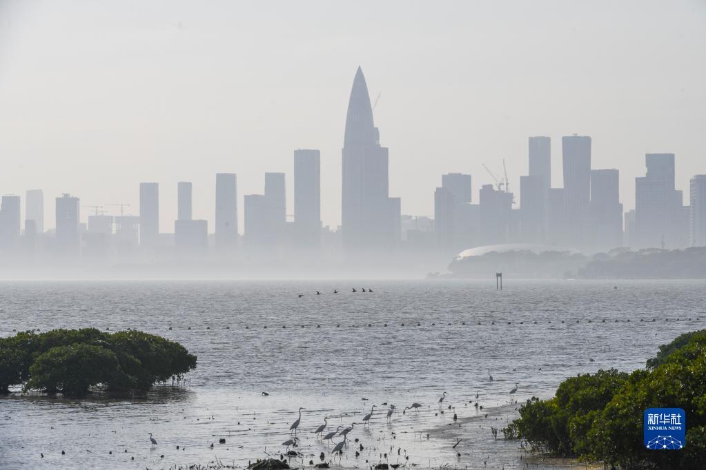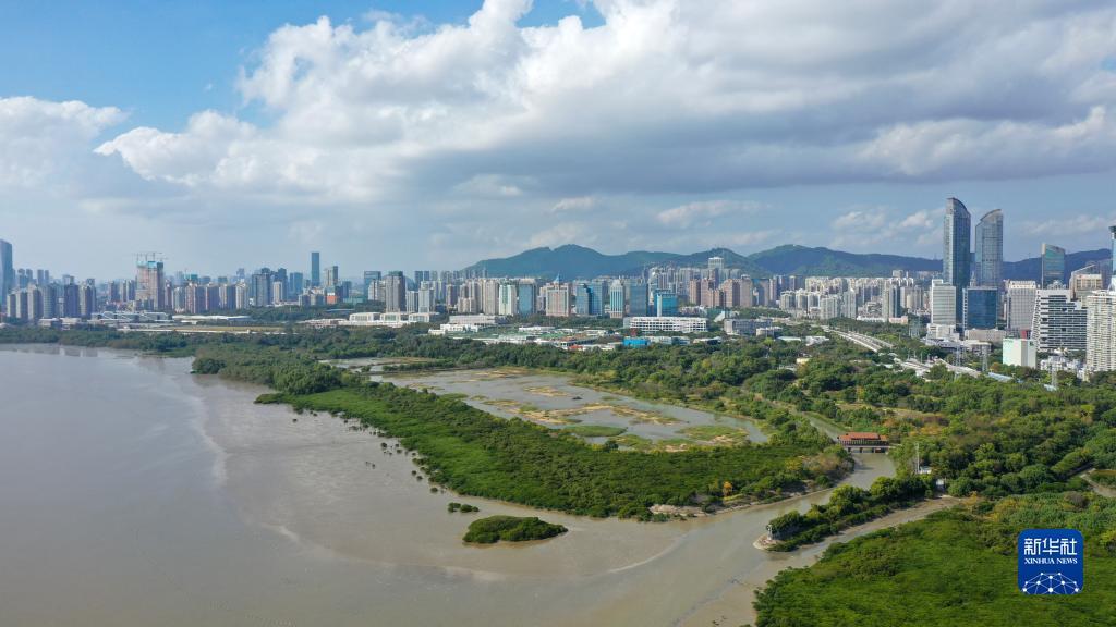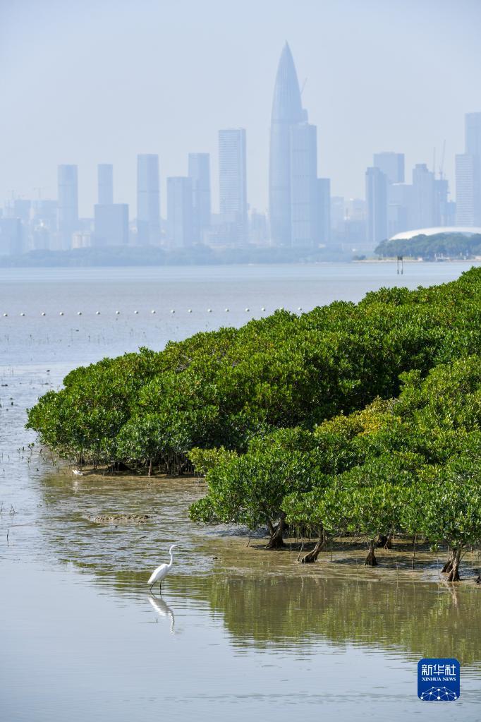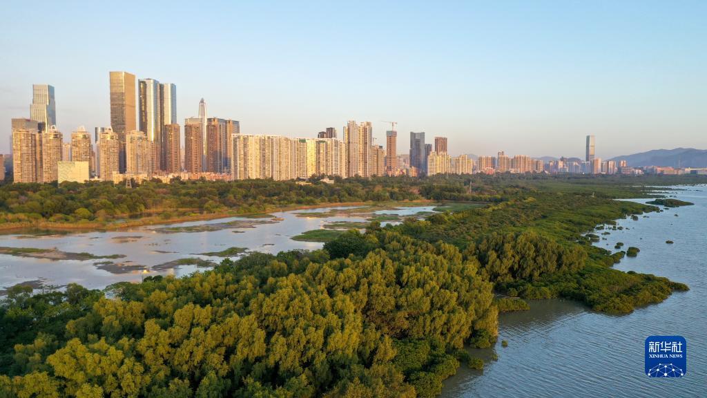 在深圳,红树林湿地与城市的高楼大厦形成人与自然和谐相处的景象(2022年12月7日摄)。
