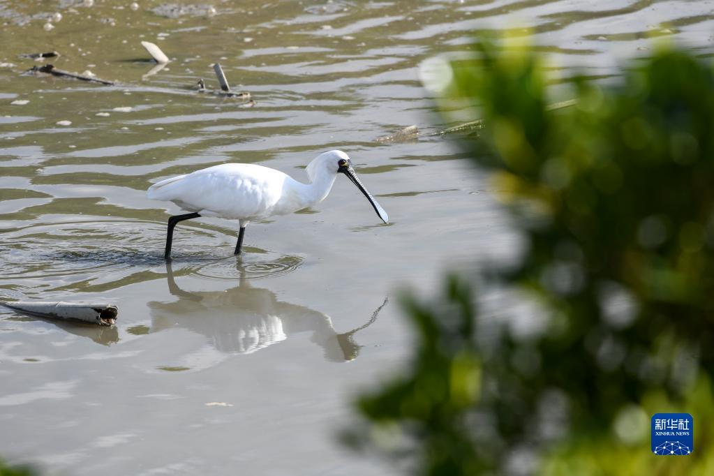 2月1日,一只黑脸琵鹭在福田红树林湿地里觅食。