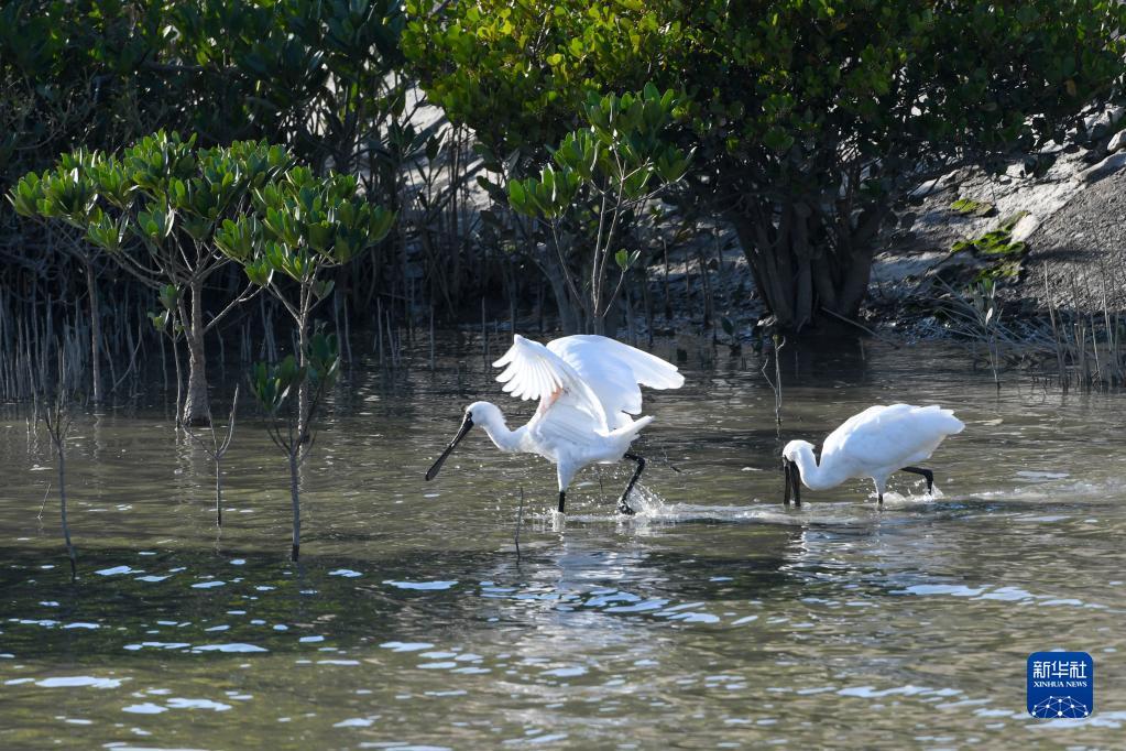 2月1日,两只黑脸琵鹭在福田红树林湿地里觅食。