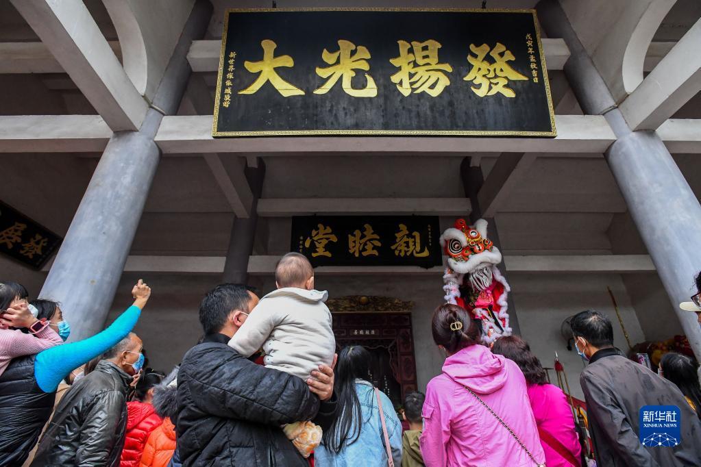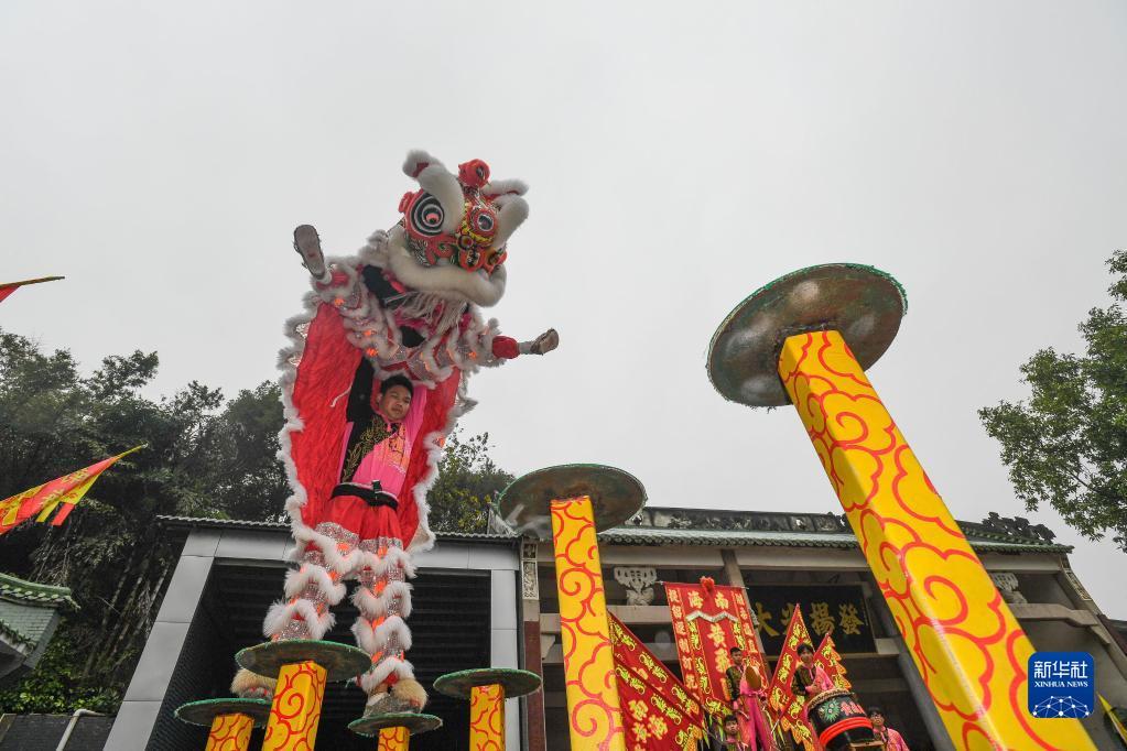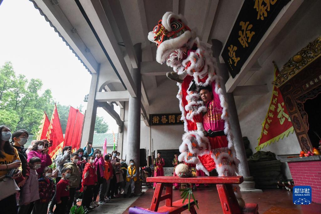 1月12日,在佛山市南海区西樵黄氏宗祠,这里现在也是黄飞鸿狮艺武术馆,狮团为游客表演醒狮。