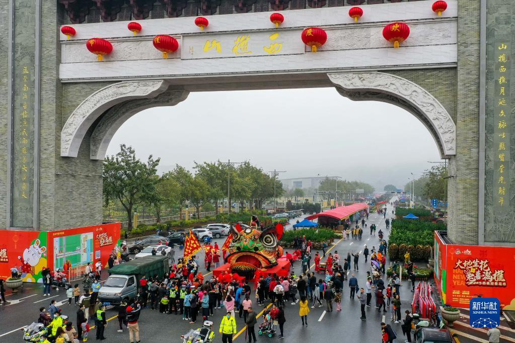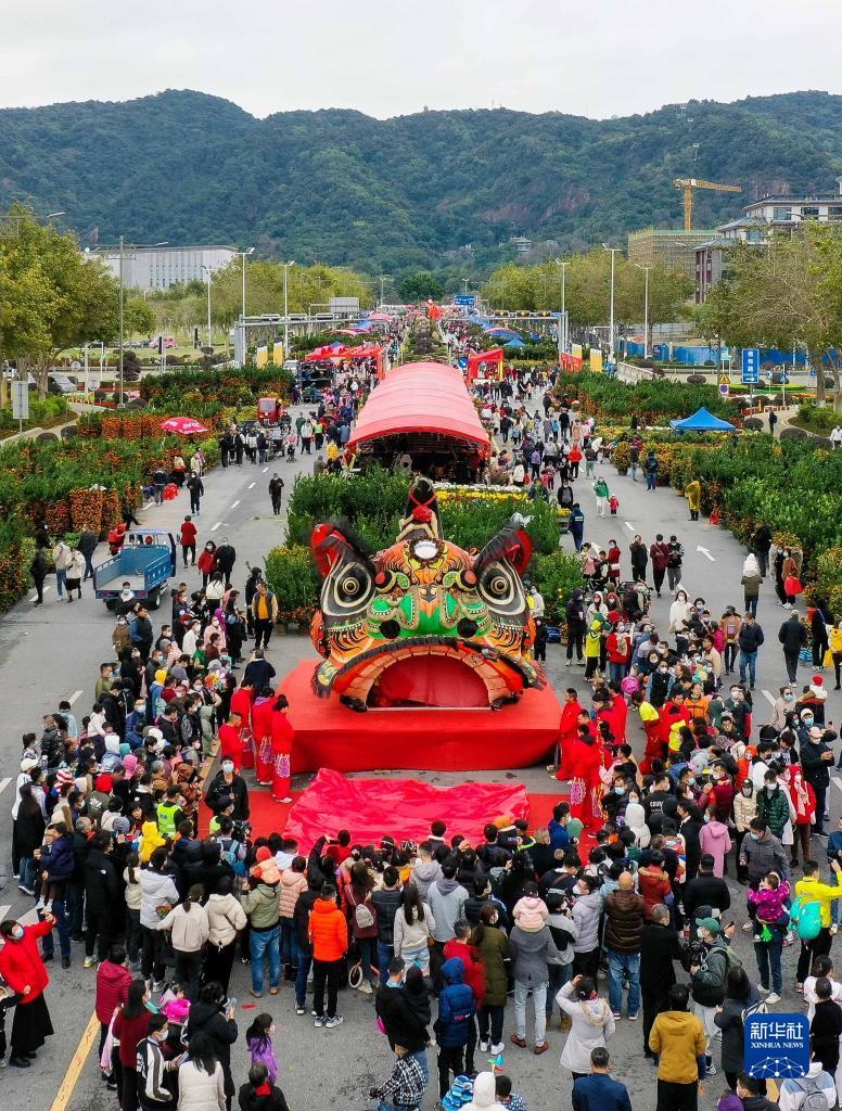1月12日,在佛山市南海区西樵镇西樵山牌坊,人们争相目睹高4.68米、宽4.5米的“狮王”狮头(无人机照片)。