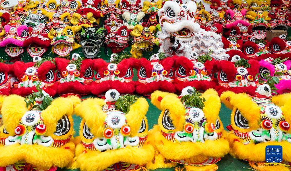 1月13日,在佛山市南海区黄飞鸿中联龙狮训练基地,一头醒狮“淹没”在身边的“狮海”里。