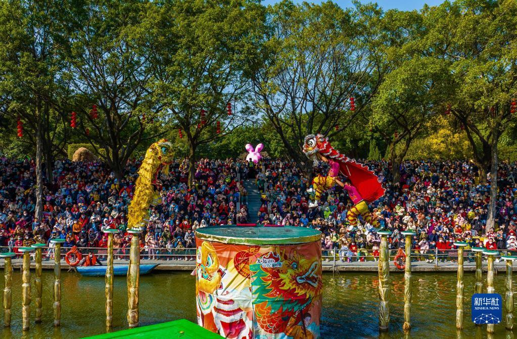 1月24日,春节期间,在位于佛山市南海区西樵镇的西樵山天湖,水上高桩醒狮表演吸引众多游客观赏(无人机照片)。