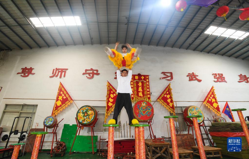 1月13日,在佛山市南海区黄飞鸿中联龙狮训练基地,选手在训练高桩醒狮。