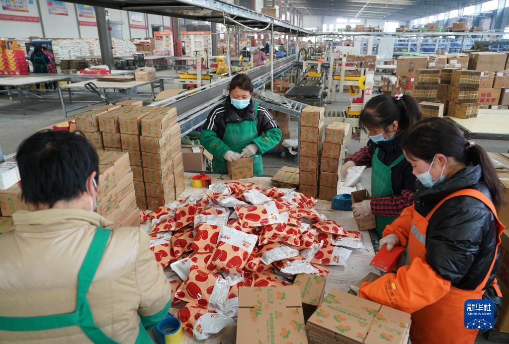 2月6日,在位于武功县的陕西美农网络科技有限公司物流仓,工作人员在打包食品快递包裹。