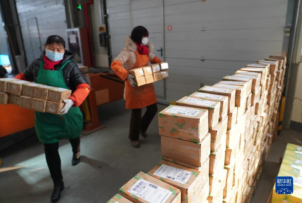 2月6日,在位于武功县的陕西美农网络科技有限公司物流仓,工作人员在处理食品包裹。