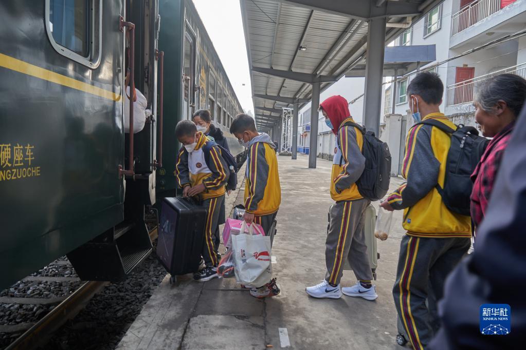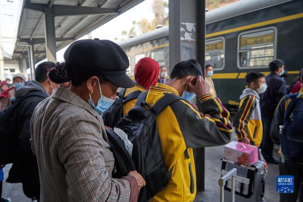 2月9日,在四川凉山州喜德县火车站,学生们登上5633次列车。