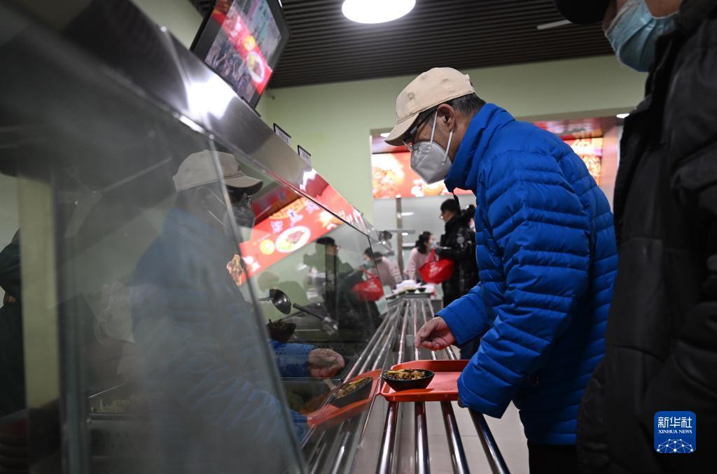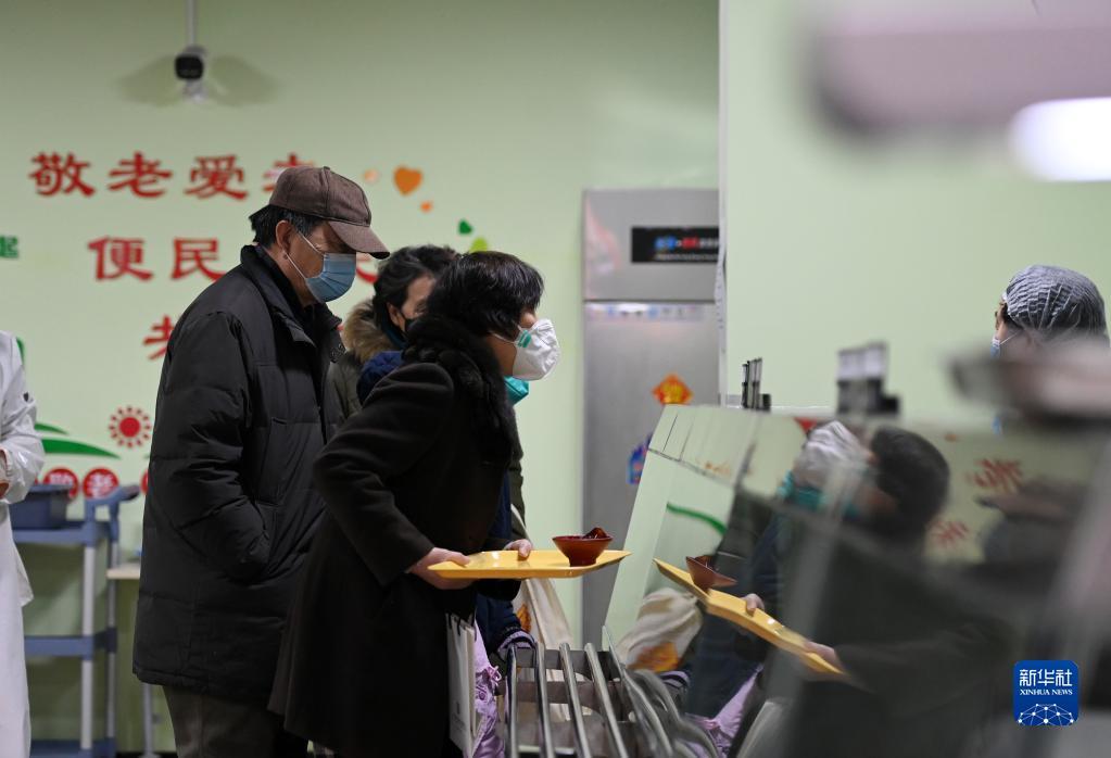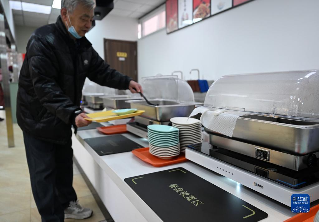 老人在天津市和平区南营门街道的老年人“智慧食堂”取餐(2月10日摄)。